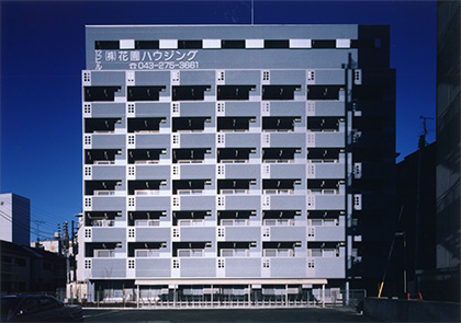 JR西船橋駅より徒歩2分の至近距離に建つワンルーム型集合住宅である。ストライプ状に凹凸を施したブルーグレー色のタイルとメタリックなアルミパネルを組み合わせた個性的な外観によって、中高層建築の密集する商業地域内においてもはっきりとした存在感を生み出している。バルコニーの開口を絞り込んだデザインは、プライバシーの確保と同時に洗濯機置場やエアコン屋外機の天吊りスペースなど機能性に配慮したものである。また27㎡という比較的ゆとりのある住戸面積、各戸テンキー式ドア錠・ウオシュレット・浴室乾燥機・高度情報化対応など、様々な安全・快適設備を備えている点も大きな特長である。(榎本)