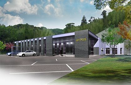 山々に囲まれた中にアクセントとして、石の壁を配置した。大きさ・壁の間隔すべて異なる石の壁は、訪れる人々に対して、安らかな気持ちにさせる。また、そこに映り込む周囲の山々は、建物も景観の一部となるように配慮した。